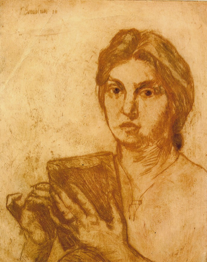 Katie, the Bernstein’s housekeeper was the subject of Theresa’s portrait in 1917. Although Theresa thought of her as a friend and part of the family. For Katie, her role in the Bernstein household was somewhere between an employee and a sister to Theresa. Bernstein did not choose sitters for their glamour or their social status, her choice of subjects was based upon people she liked. In this portrait which uses earth tones we see Katie wearing a heavy shabby coat. She is pinching the lapels tightly together. On her head is a hat, with the haloed brim positioned at a jaunty angle allowing the feathers, attached to it, to cascade downwards.