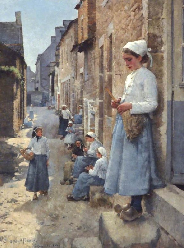 “..One of the first results of the visit to Cancale was a composition of figures in a narrow street: women in white coiffes and blue petticoats, grouped round their cottages and seated on their doorsteps engaged in their everlasting occupation of knitting blue jerseys for their fisher husbands…”