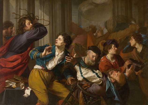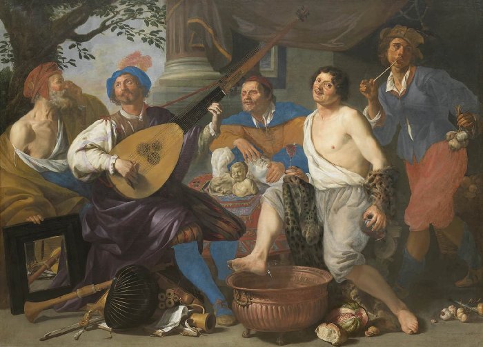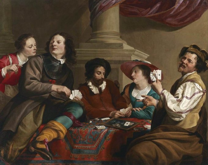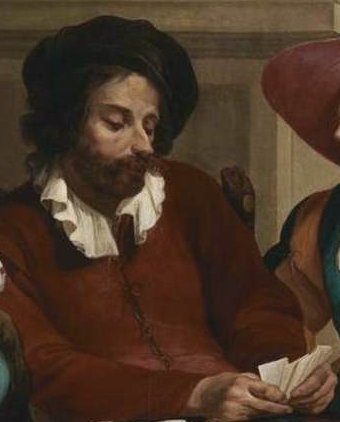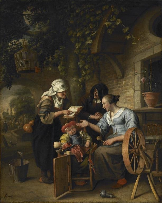 One of the greatest Dutch genre painters was Jan Steen. In Holland he ranks next to Rembrandt, Vermeer, and Hals in popularity. He is best known for his humorous genre scenes, warm hearted and animated works in which he treats life as a vast comedy of manners. Steen was born in Leiden and is said to have studied with Adriaen van Ostade in Haarlem and Jan van Goyen (who became his father-in-law) in The Hague. He worked in various towns – Leiden, The Hague, Delft, Warmond, and Haarlem and in 1672 he opened a tavern in Leiden. In his painting The Fortune Teller we see a young woman sitting by her spinning wheel having her fortune told. One interpretation of this depiction is that she is a sex worker, the old, black hooded lady is the brothel keeper and the soldiers in the background are her clients. Fortune-telling was strongly associated with deceit, and therefore frowned upon in the seventeenth century.