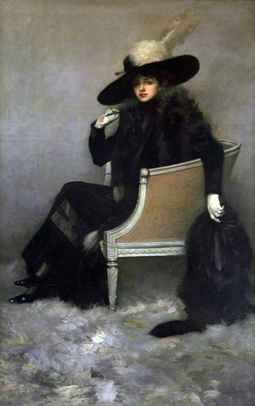The first painting, I am showcasing is Lady in Black Furs, a work by the Italian painter Pilade Bertieri, which he completed around 1912. Bertieri was born in Turin and exhibited in major cities in Italy, in New York and notably Manchester and Liverpool as well as Paris at the Salon from 1907 to 1931. The painting depicts Bertieri’s wife Genevieve Wilson, the daughter of a wealthy New York socialite. It was during a voyage in 1905 from Italy and America that they met and a year later they got married. Bertieri said that he was first attracted to Genevieve when he saw seated on a deckchair. For him, her graceful composure was just too much to resist and this depiction is a reconstruction of his first view of her but this time in a more fashionable chair. The fact that she is wearing the very same furs, shoes and velvet and satin dress as she did aboard the ship in 1912 evokes memories for him of that first meeting. At the time of the painting Genevieve was pregnant with their first child.