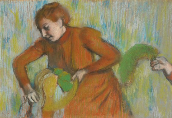 The second work is by Degas’ entitled Modiste Decorating a Hat and depicts a milliner adjusting a hat in a shop window.