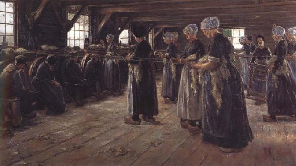 In 1875 Liebermann left Paris and spent three months in Zandvoort in Holland. It was in this Dutch town that Max acquired a brighter and more less planned style by copying paintings by one of his favourite artists, Frans Hals. Max developed a practice of setting aside time between the idea for a motif coming to him and the implementation of the larger finished painting. When he returned to Paris in the autumn of 1875 he moved into a more spacious studio and began to convert his Dutch sketches into full sized works. He returned to the Netherlands in the summer of 1876 where he remained for several months. During this stay he met the etcher William Unger, who brought him into contact with Jozef Israëls and the Hague School. One example of this change of painting style was Liebermann’s work entitled Sewing School which he completed in 1876. The sewing school depicted in this painting was in an orphanage in Amsterdam. Liebermann had started his career as a realist painter, but by the time of this work, he was already establishing himself as an Impressionist-style painter.