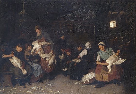 In the Spring of 1871, Liebermann lived in Düsseldorf, where the influence of French art was greater than in Berlin. Whilst in the city he met Mihály von Munkácsy, a Hungarian painter, who had earned international reputation with his genre pictures and large-scale biblical paintings. His paintings often featured scenes from the daily lives of peasants and poor people. Max saw Mihály von Munkácsy’s recently completed work entitled Tépéscsinálók and this stimulated his interest in genre painting. The subject of Munkácsy’s painting comes from memories of the 1848 Hungarian Revolution also known as the War of Independence and it depicts a wounded soldier, leaning on his crutches in a dark interior, recounting the story of life on the front line and the difficult battles he had experienced. Whilst the men were at war the girls, women, old people, and children remained at home in their villages looking after returning wounded soldiers, their kinfolk, who had suffered mentally and physically on the battle front. In this depiction the villagers listen attentively to the soldier’s emotional story and many cry (hence the painting’s title “Tearing Up”). Mihály von Munkácsy depicted the scene with particularly sympathetic memories, since the War of Independence and the tragic events that followed caused his sad childhood and saw him orphanhood at the age of six.