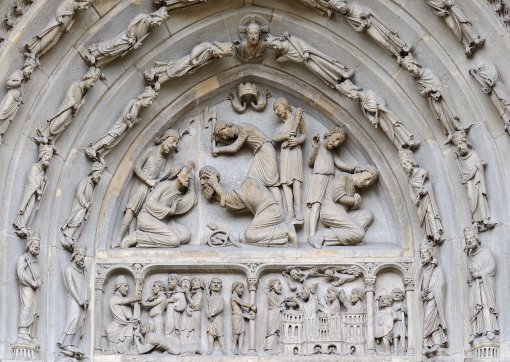Detail of the north portal sculpture; the martyrdom of Saint Denis, Eleuthere and Rustique
