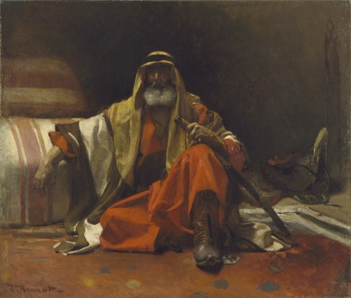 One of Léon’s works from this period was entitled An Arab Sheik which he completed once back in Paris. It is thought that Bonnat’s depiction emerged from combining multiple resources such as the French model who posed for the seated figure; the saddle we see which Bonnat brought back from his travels and a multitude of sketched notations which he made during his travels in the Middle East. Combining all this data Léon managed to create a painting that appears authentic, and yet, it is stereotypical of what Europeans believed about the Arabic world and its people such as the way the sheik holds his sword depicting his strength and fierceness and enhances how Europeans believed that that cultures in the Middle East and elsewhere were ruled by violence, in contrast to the supposedly more “civilized” societies of Europe and North America.