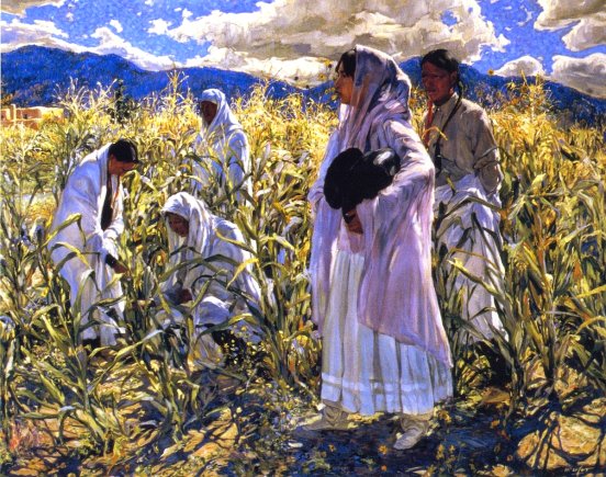 When Ufer arrived in Taos, which at the time was a small, remote town situated at the foot of the Sangre de Cristo Mountains. The population of town was made up of Catholic Hispanics who worked the land; Native Americans, a farming society, who also worked as servants, artists’ models, and other lowly menial jobs. There were also a smattering of Anglos, such as artists, bankers, and merchants.  Six of the Anglos that Ufer met after he arrived were artists, a painting group that formed the Taos Society of Artists the following year. North of the town was the famous Taos Pueblo, where Native Americans lived in a multi- storied structure similar to ones they had lived in four hundred years earlier.  None had the basic necessities such as electricity or running water.