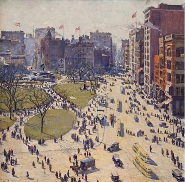 In the Winter of 1918, whilst back in New York, Ufer visited a friend of another of his wealthy patrons, William H Klauer, and completed the bird’s-eye view painting The Battery from the view he had from the apartment window overlooking the Battery district of Lower Manhattan in winter.  It is the depiction of bustling crowds around the square.  Ufer was a patriotic artist and in this work we can see American flags fluttering over tall buildings, one of which housed an army recruiting office.   Soon after the finishing this painting Walter Ufer returned to his beloved Taos where he remained for the rest of his life.