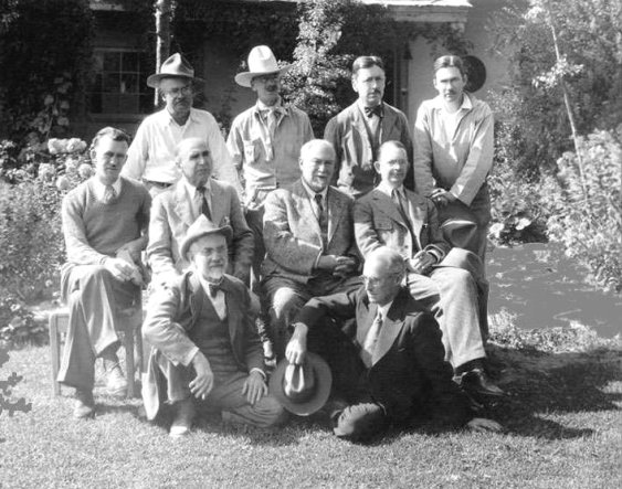 Former members of the Taos Society of Artists photographed by C.E. Lord in the Couse garden, 1932. Back row: Ufer, Dunton, Higgins, Adams. Seated: Hennings, Phillips, Couse, Berninghaus. Front row: Sharp; Blumenschein. Missing: Critcher and Rolshoven.