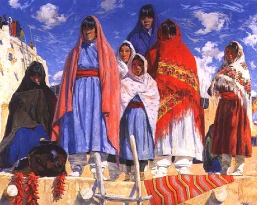 When Ufer arrived in Taos, which at the time was a small, remote town situated at the foot of the Sangre de Cristo Mountains. The population of town was made up of Catholic Hispanics who worked the land; Native Americans, a farming society, who also worked as servants, artists’ models, and other lowly menial jobs. There were also a smattering of Anglos, such as artists, bankers, and merchants.  Six of the Anglos that Ufer met after he arrived were artists, a painting group that formed the Taos Society of Artists the following year. North of the town was the famous Taos Pueblo, where Native Americans lived in a multi- storied structure similar to ones they had lived in four hundred years earlier.  None had the basic necessities such as electricity or running water.