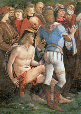 Art historians believe that Signorelli collaborated on this work with his friend, Bartolomeo della Gatta, a painter, illuminator, and architect. The more active figures being executed by Signorelli. One such figure, a seated nude youth in the centre of the foreground, is believed to have served as a reference for the twenty nude figures – what Michelangelo called the Ignudi – painted on his famous chapel ceiling 25 years later.