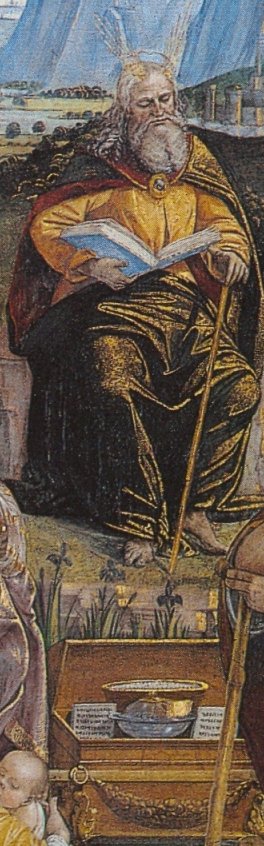 On the right foreground of the fresco sits the hundred-and-twenty-year-old Moses on a rise, holding his staff and with golden rays circling his head. At Moses’s feet stands the ark of the Covenant, opened to show the jar of manna inside and the two tablets of the law.