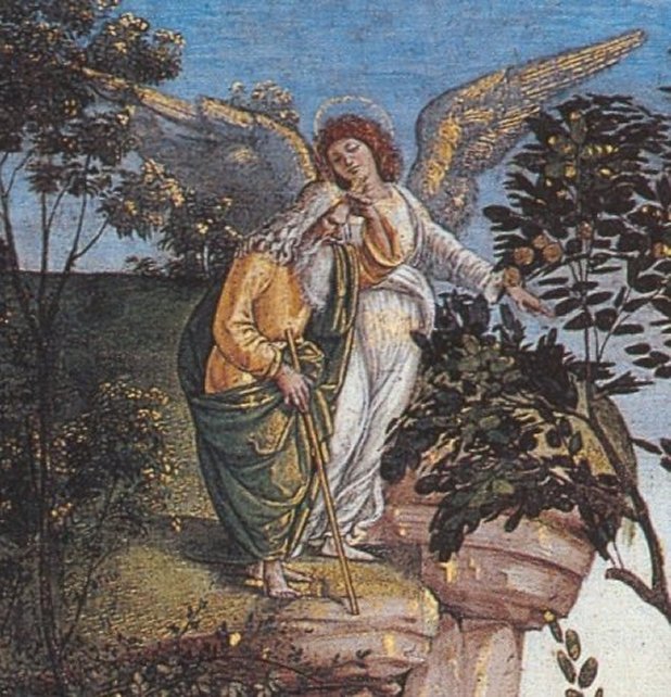 In the centre of the background, we see Moses being led by the angel of the Lord up Mount Nebo, from which he will be able to look across to the Promised Land that by the will of God he will never enter.