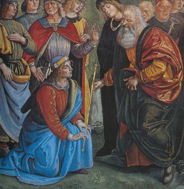 In the left foreground of the picture we see Joshua being appointed as Moses’s successor. Joshua kneels before Moses, who gives him his staff.