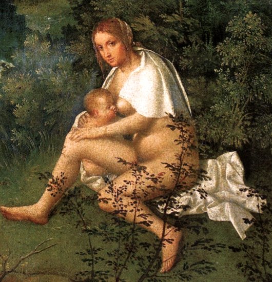 There are three humans in the painting. On the right in the foreground is a woman almost naked except for a white cloth which she and the baby are sitting upon, the end of which is wrapped around both her shoulders. She and the baby are sitting on the bank of a small narrow stream. Sitting on the ground next to her right thigh is a baby suckling on her left breast. The woman gazes out at us.