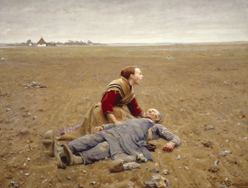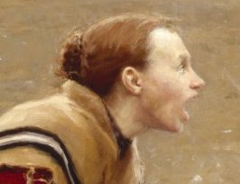 One of Ralph Hedley’s 1891 paintings, Go, and God’s Will be Done, fascinates me as there is a story behind the depiction. At first glance there is obviously something dramatic happening in this painting, but what is it all about? On the floor in the left foreground a cat sleeps peacefully before the fire, unaware of the chaotic happenings going on in the room. This is the home of a lifeboatman and in the bed is his wife who is very ill. The husband, in his shirt sleeves, leans over to talk to her. Next to him stands a lifeboatman who has come to take him away to their lifeboat. The door of his cottage is held open by his daughter and we can see that outside there is a gale force wind blowing over rough seas, in which is a boat in trouble. The call has gone out for all the local lifeboatmen to rush to launch the lifeboat and the wife’s husband is torn between his duty to his sick wife and his duty to the lifeboat rescue. The painting is based on the English poet and journalist, George Roberts Simms poem, The Lifeboat. The words of the poem which Hedley has illustrated so beautifully are: