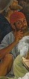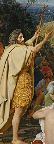 In the middle ground we see the solitary figure of Christ on a rocky mound approaching the gathering. Behind him in the background is a wide plain and the distant mountains. His figure is small in comparison to the others but nevertheless stands out because of it being a lone figure. In the foreground of the picture there are a number of male figures of varying ages, some of whom are already undressed waiting to be baptised.