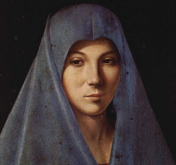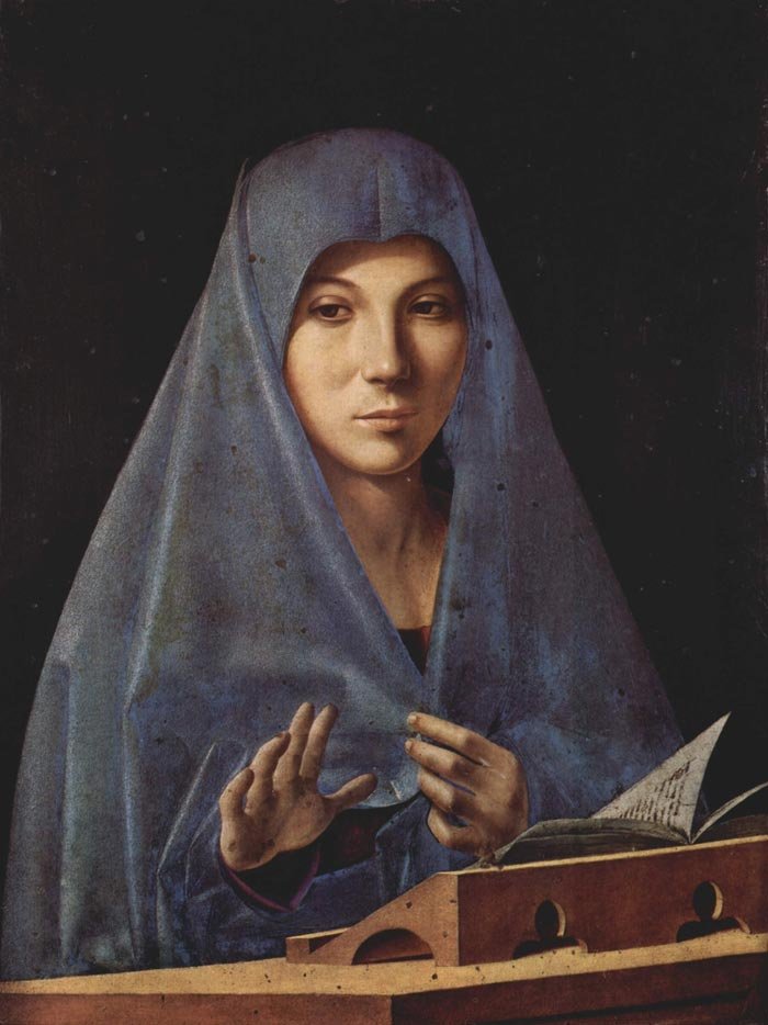 For my featured painting today I give you Virgin Annunciate which Antonello completed whilst in Venice around 1476 and is now housed in the Galleria Regionale della Sicilia in Palermo. It is probably his most famous work. The painting is a hauntingly beautiful image of an adolescent Mary at the time the angel Gabriel came to her to tell her that she would bear God’s son. Look closely at her beauty as depicted in this bust length portrait by Antonello. She sits before us dressed in a simple blue mantle. She clasps her blue mantle closed and holds it modestly in front of her chest. The background is plain and does not distract us from staring at the young woman. She sits at a reading desk. Before her, on the desk, is a book of devotions which she has been reading. We have disturbed her. She looks up at us. The angel Gabriel as is the case in most Annunciation scenes, is not present. It is simply implied. Her right hand is raised in a blessing gesture to Gabriel but as he is not in the painting, it is as if she is greeting us, the viewer. It is just her and us.