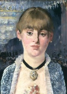 Eva Gonzales completed a similar work entitled Une loge aux Italiens (A box at the Théâtre des Italiens), which she also completed in 1874. She submitted this painting to the Salon jurists for inclusion in the 1874 Salon but it was rejected. Eva Gonzalès then made some changes to the painting and, five years later, once again submitted it for inclusion at the 1879 Salon and this time it was accepted. The critics loved the work. Gonzales was pleased to tell people that she had been a pupil and a good friend of Manet. Manet’s influence on Gonzales can be clearly seen in this painting in the choice of a modern subject and the way Gonzales has juxtaposed light with dark, with the pale skin and light-coloured fabrics against a dark background. Also, note the inclusion by Eva of the bouquet which rests on the edge of the box and its similarity to the bouquet held by the maid in his Olympia depiction.