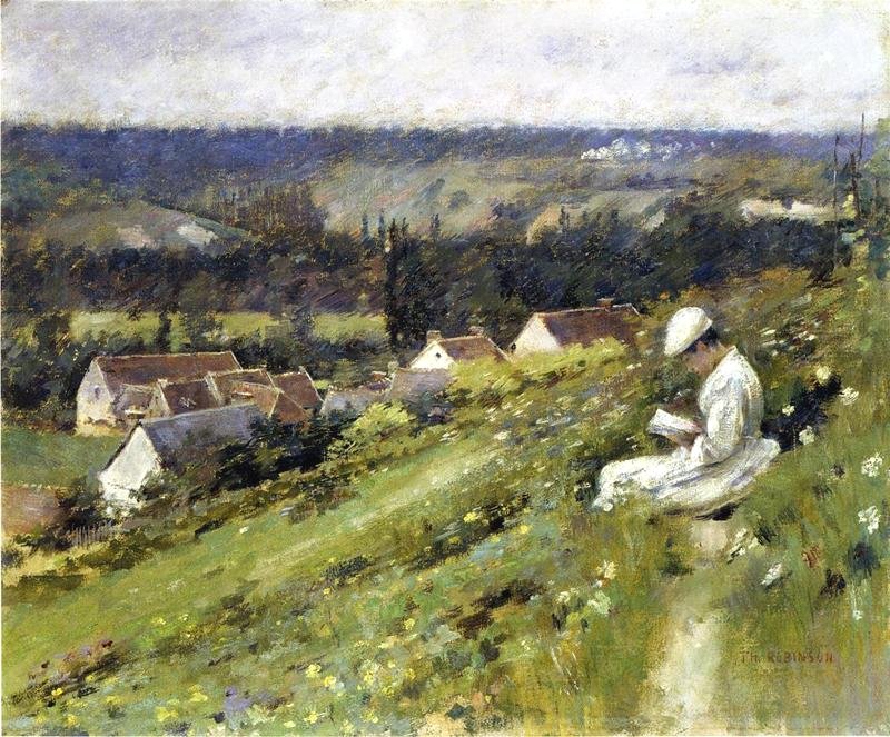 Another of Theodore Robinson’s works featuring Marie was his beautiful 1888 work entitled Val D’Arconville, which can be seen at the Chicago Institute for Art.  In this depiction, we see Marie sitting on a flower-filled hillside overlooking the Arconville Valley which is situated southeast of Paris.  In the painting, Robinson used densely layered, broken brushwork, which was a technique he picked up from Monet.  This clever artistic method has the observer of the work relinquish their focus on the woman and their eye is led down the slope, and across the valley.  This was not simply an impressionistic painting which captured momentary effects such as the grass moving in the breeze, it becomes more of a structural work with the inclusion of the houses in the middle ground.